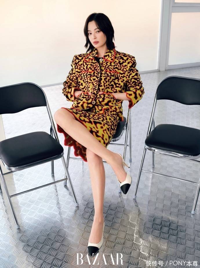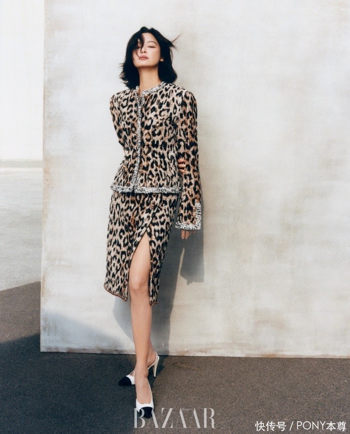 豹纹开叉半身裙则为造型注入了灵动感,搭配黑白撞色高跟鞋,修饰腿部线条,让她看起来更显高挑修长。